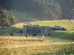 The location of the proposed reservoir was remote and large quantities of construction materials would be required to construct the earth dam.[2] The Water Trust decided to construct a private railway for the purpose. The Peebles branch of the Caledonian Railway (which had been built as the Symington, Biggar and Broughton Railway) ran west to east through Broughton, and the Trust negotiated with the Caledonian Railway over a private branch line connection. This was agreed in April 1895. The private railway would run southwards for about eight miles (13 km) along the valley of the River Tweed from east of Broughton station. The Caledonian agreed to lay a second track, at the expense of the Water Trust, alongside its own single line from Broughton station to the point of divergence of the new railway. At first a northwards branch line at Broughton was planned to extract clay for sealing the reservoir, but this was later changed, and the material was imported from elsewhere.[3]