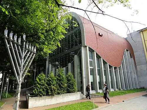 The privately funded synagogue in central Tallinn was inaugurated on May 16, 2007. The building is an ultramodern, airy structure, which can seat 180 people[2] with additional seating for up to 230 people for concerts and other public events. It received global attention as it was the first synagogue to open in Estonia since World War II.[3][4][5][6][7][8][9][10]