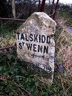 Talskiddy was once an ancient manor belonging to the Duchy of Cornwall. Previous to the formation of the Duchy, it was one of 17 manors belonging to the Earl of Cornwall.[1] It is recorded that Richard, Earl of Cornwall purchased three Cornish acres at Talskiddy. These seventeen 'ancient manors' were known collectively as the Antiqua maneria. The manorial custom of "Free Bench" was practised here. It was once a centre for the woolcombing industry. Many of the older houses in the village are built of cob.