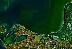 The Taman Bay (Russian: Таманский залив) is a shallow bay or gulf on the east coast of the Strait of Kerch shaped on the southern side by the Tuzla Spit and to the north by the Chushka Spit. It dips into the Taman Peninsula of Krasnodar Krai, Russia for about 16 km. The bay is 8 km wide at its mouth and is up to 5 metres deep. Fishing villages and the old townlet of Taman afford fine views of the bay.