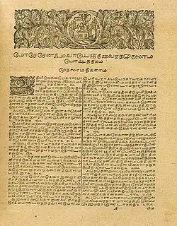 The history of Bible translations into the Tamil language commences with the arrival of Bartholomäus Ziegenbalg at Tranquebar in 1706.[1]Johann Philipp Fabricius, a German, revised Ziegenbalg's and others work to produce the standard Tamil version. Seventy years after Fabricius, at the invitation of Peter Percival a Saiva scholar, Arumuka Navalar, produced a "tentative" translation, which is known as the "Navalar version," and was largely rejected by Tamil Protestants.[2]