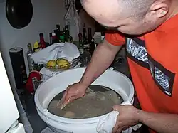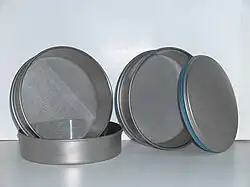 A tamis (pronounced "tammy", also known as a drum sieve, or chalni in Indian cooking[1]) is a kitchen utensil, shaped somewhat like a snare drum, that acts as a strainer, grater, or food mill. A tamis has a cylindrical edge, made of metal or wood, that supports a disc of fine metal, nylon, or horsehair mesh. To use one, the cook places the tamis above a bowl and adds the ingredient to be strained in the centre of the mesh. The food is then pushed through using a scraper or pestle. Tamises have been in use since the Middle Ages.[2]