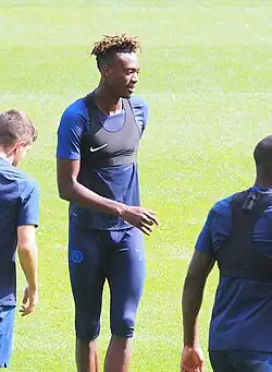 His form at youth level caught the attention of interim manager Guus Hiddink who invited him to train with the first team at the back end of the 2015–16 season.[8] On 11 May 2016, Hiddink handed Abraham his Chelsea debut in a 1–1 Premier League draw with Liverpool, bringing him on to replace Bertrand Traoré in the 74th minute.[9] Abraham then made his home debut at Stamford Bridge the following week, once again coming on as a second-half substitute for Traoré in a 1–1 draw with newly crowned Premier League Champions Leicester City.[7]