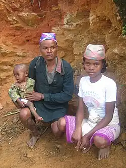In 2013, the Tanala numbered around 400,000 people.[4] Their name means "people of the forest."[1] Several Tanala rulers trace their lineage back to Antaimoro ombiasy (wisemen) who migrated to the area after 1550.[5] Tanala people identify with one of two sub-groups: the southern Ikongo group, who managed to remain independent in the face of the expanding Kingdom of Imerina in the 19th century, or the northern Menabe group, who submitted to Merina rule.[5] The Ikongo group live in the southernmost portion of the massif on fertile land that is easily accessible to neighboring ethnic groups and so has historically been a crossroads of cultures. The Menabe group just north of Ikongo live in the more rocky and mountainous area and have been largely isolated. Most people living in this area are descended from members of other groups who were defeated in local conflicts and were pushed from more desirable land into this inaccessible area, where they could take refuge.[6] Recently, researchers have suggested that the Tanala are not truly a separate ethnic group.[5] They have never been united as a single ethnic nation.[7]