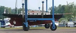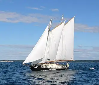 The Tancook schooner, with its counter stern and characteristic round, or "spoon", bow was a distinctive type of small sailing work boat built primarily on Big Tancook Island, Nova Scotia, and the immediate surrounding area on and near Mahone Bay. The design succeeded the earlier double-ended Tancook whaler fishing boats. The Tancook schooners were usually larger than the Tancook whalers and had fixed keels rather than centreboards. The sail plan for the smaller sizes of transom-sterned schooners was typically gaff-rigged fore and main and one or sometimes two headsails. After about 1930, Marconi main sail rigs were common and a number of the smaller schooners were rigged as knockabouts flying a single jib without a bowsprit keeping the head sail rigging on deck.