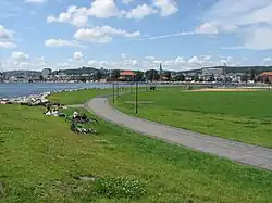 Tangen Park is a grass park in the tip of Tangen, there is a pedestrian road around the area and a playground in the middle, the area is also located with public bathrooms and bench down to the shore for fishing etc.