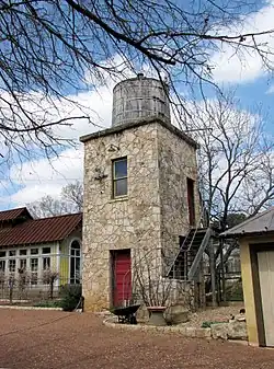 A tankhouse (also spelled tank house or tank-house) is a water tower enclosed by siding. Tankhouses were part of a self-contained domestic water system supplying the house and garden, developed before the advent of electricity and municipal water mains. The system consisted of a windmill, a hand-dug well and the tankhouse. The windmill pumped water from the well up into the tank at the top of the tankhouse, from where it flowed down under gravity pressure to the house and garden. The system used no fuel or electricity.