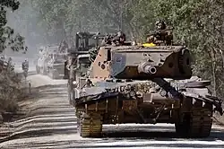 After an internal debate on whether the Army should continue to operate tanks as part of its force structure, in 2004 the Australian Government decided to replace the Leopards with a small fleet of American M1A1 Abrams tanks to provide close support for infantry when operating in jungle or urban areas.[107] After 31 years of service the Leopards were subsequently replaced by 59 M1A1 Abrams AIM, which began entering service in 2007.[61][108] Seven M88A2 Hercules Armoured Recovery Vehicles (ARVs) were also acquired.[109] The Leopards never saw operational service, although during the 1999 East Timor crisis the regiment was placed on standby to deploy in the event the conflict escalated, while it was not deployed during Australia's involvement in the 2003 invasion of Iraq.[110][111] By this time the Leopards were considered unsuitable for deployment in a high threat environment.[112][113] As of 2007 the 1st Armoured Regiment, located in Darwin as part of the mechanised 1st Brigade, was the only armoured unit in the Australian Army equipped with main battle tanks, operating the M1A1 Abrams AIM.[114] A small number of M1A1s were also operated by the School of Armour at Puckapunyal for training purposes.[110]