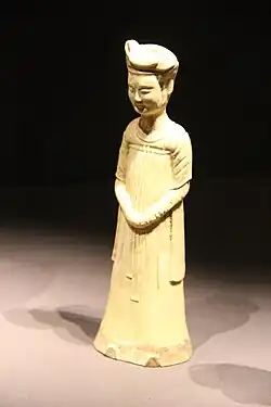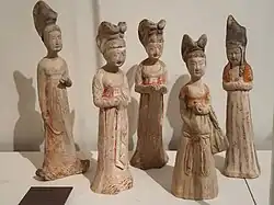 Unearthed artefacts dating in the Tang dynasty, such as sculptures and paintings show that the long-sleeves, low-cut inner shirt could be tucked under the long (high-waisted[3]: 93 [9]: 85 ) skirts.[10]: 291 The skirts could be embellished with stripe patterns of two colours or be found in monochrome colours.[4][10]: 291 [9]: 87 The banbi falls above the waist[10]: 291 or were waist-length,[4] and they could be embellished with embroidered borders at the wrist.[10]: 291 The banbi could also be tucked under or worn over the long skirt.[4][3]: 93–94 The tanling ruqun can also be worn together with a shawl, called pipo (Chinese: 披帛), around the arms or the shoulders of its wearer;[9]: 85–86 they could also wear it together with variety of hats.[10]: 291 In the Tang dynasty, hats of foreign origins or influence, such as the mili, weimao and humao, were worn when horseback riding.[10]: 291