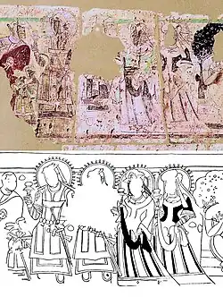 In the early Tang dynasty up to the late 8th century,[4] banbi were also popular among women, including noble and common women.[15] According to the New Book of Tang, "banbi, skirt, and ru are common clothes for maids served at the Eastern Palace".[15] In the 7th century, palace women could wear banbi over a plain shirt and a high-waisted, A-line skirts which could be monochrome or striped.[4] In the Tang dynasty, new styles of Tanling banbi appeared and became extremely popular.[13] Some shapes of banbi (such as the tanling banbi) worn in the early Tang appears to have been mainly influenced by the banbi worn in Qiuci.[15] Figures wearing banbi and striped skirt holding a shawl (pipo) and wearing low cut upper garments appear on the murals of Kizil Grottoes in Xinjiang; the shape and matching garments customs were similar to the early Tang dynasty's women clothing attire.[15] In the first decade of the 8th century, skirts in monochrome colours became more popular than stripped skirts.[9]: 85 By the mid-Tang dynasty around the mid-8th century, upper garments with low décolletage lost popularity and women started to cover themselves with shawls; there were also new ideals of beauty favouring extremely plump and voluptuous women over the youthful slenderness of the Sui and the early Tang dynasties.[11]: 25
