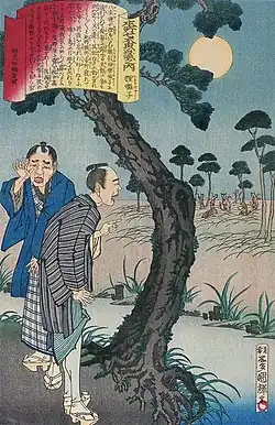 In the Edo period, in Honjo, Sumida, Tokyo, they are also called baka-bayashi (馬鹿囃子) and as a ghost story that takes place in Honjo, they are counted as one of the Seven Mysteries of Honjo.[3] When one thinks that one has heard the sound of an orchestra, even if one tries to walk towards where the sound is coming from, the sound goes further away as if it were trying to flee, so that it would be impossible to know the source of the sound.[2][3] If dawn comes while one is following the sound, it is said that one would notice that one is in a place one has never seen before. Matsura Seizan, the lord of the Hirado Domain, also encountered this strange phenomenon and ordered people to find the source of the sound, but the sound disappeared near Warigesui, so that it was not possible to continue following it.[2] Just like its name, it is said to be the work of a tanuki and searches for tanuki were also conducted around locations where the sound was heard, but no traces of tanuki were able to be found either.[4]