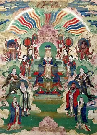 Under the Ming dynasty (1368–1644), aspects of Confucianism, Taoism, and East Asian Buddhism were consciously synthesized in the Neo-Confucian school, which eventually became Imperial orthodoxy for state bureaucratic purposes.[102] Taoist ideas also influenced Neo-Confucian thinkers like Wang Yangming and Zhan Ruoshui.[103] During the Ming, the legends of the Eight Immortals (the most important of which is Lü Dongbin) rose to prominence, being part of local plays and folk culture.[104] Ming emperors like the Hongwu Emperor continued to invite Taoists to court and hold Taoist rituals that were believed to enhance the power of the throne. The most important of these were connected with the Taoist deity Xuanwu ("Perfect Warrior"), which was the main dynastic protector deity of the Ming.[87]