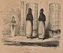 Tapada limeña (means "Liman [fem.] covered one") was the denomination used at the time of the Viceroyalty of Peru and the first years of the Republic to designate the women in Lima who covered their heads and faces with comfortable silk mantones, revealing just one eye.[1] Its use began in the 16th century[2] and it spread until well into the 19th century, that is, its use lasted for three centuries and was not only limited to the "City of the Kings", but also to other important cities in the region. In Lima, the custom remained until well into the Republic, when it was relegated by French fashions.