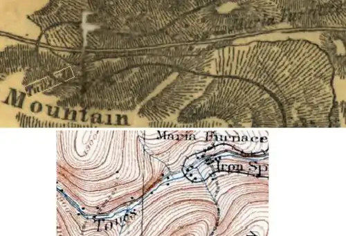 The Tapeworm Railroad (Gettysburg Rail Road) was a railway line planned by Congressman Thaddeus Stevens and nicknamed by opponents ridiculing a lengthy serpentine section around the Green Ridge[2] of South Mountain[3] after an orator compared the path to a tapeworm depiction on a product's packaging.[4] Switchbacks were planned on the west slope at Hughs Forge[5] along the E Br Antietam Creek ("Cold Spring Cr" in 1839) and on the east slope at Stevens'[6] 1822[7] Maria Furnace along Toms Creek (Monocacy River), with three east slope tunnels through spurs of Jacks Mountain.[1]