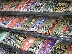 Tapis (Rejang: ꤳꤶꥇꤼ꥓; Indonesian: kain tapis or simply tapis) is a traditional Tenun style and also refers to resulting cloth that originated from Lampung, Indonesia.[5][6][7][8] It consists of a striped, naturally-coloured cloth embroidered with warped and couched gold thread. Traditionally using floral motifs, it has numerous variations. It is generally worn ceremonially, although it can be used as a decoration. It is considered one of the symbols of Lampung and Lampungese.[9]