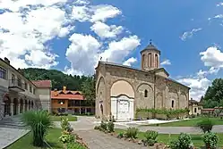 The Rača monastery is a Serbian Orthodox monastery built by king Stefan Dragutin (1276-1282) on the right bank of the Rača river. Three centuries later, a famous scriptorium, known as the School of Rača (Serbian: Рачанска школа, romanized: Račanska škola) developed and flourished in the 16th and 17th century. The monks translated texts from Ancient Greek, wrote histories, and copied manuscripts. They translated and copied not only liturgical but scientific and literary works of the period so the history of Serbian literature is owing a lot to it. Turkish travel writer, Evliya Çelebi noted in his travelogue of 1630 that in Rača Monastery there were 300 monk scribes, who were served by 400 shepherds, blacksmiths, and other staff. The security guard included 200 armed men. It was damaged several times during the Ottoman period. During the Great Turkish War the monastery was partially destroyed by the invading Turks in 1689. In 1826 it was reconstructed due to being burned down several times. Gendarmerie lieutenant colonel Jaraković handed over the Miroslav Gospel to hegumen Platon Milojević in 1941, who kept it during the war. The Rača monastery is declared a cultural monument.[12] Next to the monastery's glebe is the horse ranch and training yard "Dora", opened in 2007.[23]