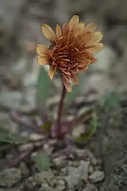 Taraxacum carneocoloratum, also known as the pink dandelion[1] or fleshy dandelion,[2] is a perennial species of dandelion.[3] The species is endemic to Yukon and Alaska, occurring only in unglaciated areas of western Yukon, specifically North Fork Pass in the Ogilvie Mountains and Ivvavik National Park. The species is characterized by the absence of horns or tubercles on the tips of the involucral bracts, a typically small height of less than 9 cm, pink to flesh-colored petals, and a yellowish pappus.[4] It blooms between June and August.[5] The species was first described in 1945.[6]