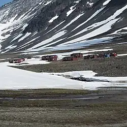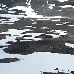 Valter Schytt remained the leading personality and promoted the development of the research station until his death in 1985.[3] The number of station buildings gradually increased and annual university courses at Tarfala Research Station could start in 1959. Tarfala Research station was officially opened as a research station of Stockholms University in 1961 and expanded by four buildings through a grant from the Wallenberg Foundation. A sauna, a laboratory, a lecture hall and additional living quarters were added in the following years. Winter storm destroyed some buildings in 1975, 1985 and 1993; spring slush avalanches damaged the laboratory hut in 1982 and again in 1991. The damaged buildings were repaired or reconstructed during the following summers.