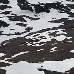 Whereas permafrost occurrences in palsa bogs were well known already in the beginning of the 20th century[12] and many permafrost studies were done on Spitzbergen, it was doubted until the early 1980s that mountain permafrost is present in the Scandinavian mountains. Its widespread existence at Tarfala could be proved in 1976 with refraction seismic soundings. It was demonstrated clearly, that Tarfala valley belongs to the region of discontinuous mountain permafrost. The active layer thickness on protalus ramparts and other wind exposed ridges was up to two meters.[13] Four years of systematic permafrost research in the Tarfala valley followed during the years 1977 till 1980, applying different geophysical methods (seismic and DC-geoelectrical soundings in summer, continuous measurements of the ground temperatures in boreholes to get the mean annual ground temperature). In March 1980, measurement of the basal temperature of the snow cover[14] and snow distribution were used to secure the findings. The field studies allowed to sketch a reliable picture of the permafrost distribution in the Kebnekaise region. Detailed results were published in 1982 and later on.[15]