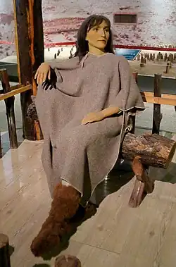 The Princess of Xiaohe (Chinese: 小河公主) was unearthed and also named by the archaeologists of Xinjiang Institute of Archaeology at Xiaohe Cemetery Tomb M11, 102 km west of Loulan, Lop Nur, Xinjiang in 2003.[58] She has reddish brown hair and long eyelashes and was wrapped in a white wool cloak with tassels and wore a felt hat, string skirt, and fur-lined leather boots. She was buried with wooden pins and three small pouches of ephedra and twigs and branches of ephedra were placed beside the body.[59] She is not permanently exhibited in any museum.