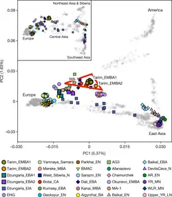 Zhang et al. (2021) proposed that the 'Western' like features of the earlier Tarim mummies could be attributed to their Ancient North Eurasian ancestry.[42] Previous craniometric analyses on the early Tarim mummies found that they formed a distinct cluster of their own, and clustered with neither the European-related Steppe pastoralists from the Andronovo and Afanasievo culture, nor with inhabitants of the Western Asian BMAC culture, nor East Asian populations further East.[43]