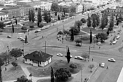 The original tram terminus was located outside the Charles Moore & Company department store with services operating via a loop in an anti-clockwise direction in the south-western corner. As part of the rebuilding of the square, in December 1966 the tram terminus was relocated near the centre of the square with Grote and Wakefield Streets to the north and Gouger and Angas Streets to the south.[22][23]