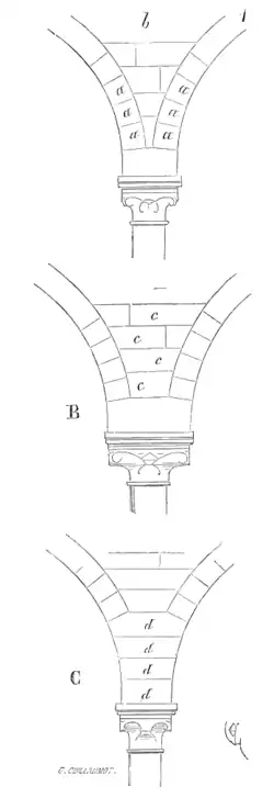 In architecture, tas-de-charge is a French term, also used in English, given to the lower courses of ribs of a Gothic vault, which are laid in horizontal courses and bonded into the wall, forming a solid mass. This helps bond the ribs, vault and walls together. They generally rise about one-third of the height of the vault, and as they project forwards they lessen the span to be vaulted over.[1]