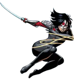 Takeo spends days preparing himself before taking both swords to the Yamashiro residence, demanding his brother to duel for the "prize" of Tatsu.[6] During the course of the struggle, a fire is started, and—while Maseo is distracted by his children—Takeo kills his brother with the sword that later becomes known as "Soultaker". Tatsu arises just in time to see her husband die and engage Takeo, gaining the upper hand and disarming him. Attempting to save her children, she hears her husband's voice coming from the sword, telling her they are already lost. Escaping with her life, Tatsu begins training as a samurai under a master called Tadashi. After much time, she graduates from his tutorship and leaves for America where she intends to use her talents to fight for justice. She takes the codename Katana after the sword that she wields, possessed for some time by the soul of her husband.[6][8]