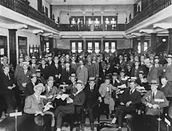 In 1936 an adjoining property in Queen Street was bought for £18,500 to enable the clubrooms to be extended. Constructed by J Hutchinson and Son, to the designs of T R Hall and L B Phillips, these extensions contained a new Art Deco dining room and were opened on 27 June 1939. The Members Dining Room features a 10.7-metre (35 ft) high ceiling, Queensland maple and silky oak, a mezzanine balcony, and murals created by local artists W Bustard, C H Lancaster, P Stanhope Hobday and Melville Haysom that depict the Australian landscape. The Art Deco features of this stunning room includes several decorative windows, grooved plasterwork in the ceiling and striking marble columns.[2] In 1949 further Queen Street property was acquired and again the club expanded with the provision of a library and new offices.[1]