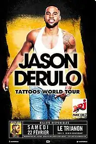 Tattoos World Tour was a world tour by R&B and pop singer Jason Derulo. It was his second headlining world tour and his first headlining tour since he broke a vertebra in January 2012 while rehearsing for his Future History World Tour, leading to its cancellation.[1] The tour made stops in most parts of Europe and Australia, with Conor Maynard as his opening act.[2] Due to popular demand after the March 20 and March 22, 2014, shows in England had sold out, two more dates were added to the March show line-up, on March 25 and March 27, 2014, in Newcastle at the O2 Academy auditorium and in Leeds at the Leeds Academy, with another show added during the second leg of the tour in Rabat, Morocco in Africa.