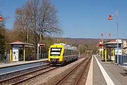 A long run through open fields leads to Usingen, where the line's central signal box is located and trains are stored, assembled, disassembled and refueled. This was formerly the location of the loading station of the 4 km-long narrow-gauge railway to a geyserite works (now Bremthaler Quarzitwerk)[3] and a siding from Raiffeisen Waren-Zentrale Rhein-Main (an agricultural cooperative). The section with the steepest grade (up to 2.147%) begins there; Wilhelmsdorf station, which is at the end of it, is a good 390 metres above sea level. A narrow gauge railway branched off here against the direction of travel to Merzhausen military airfield (now used for the Erdfunkstelle Usingen, Usingen earth station). After another slight climb past the junction of the BGS camp, the line reaches its high point at the edge of the forest. From there it goes to Grävenwiesbach, where some trains can be stored, and down around a loop to Hundstadt.