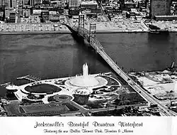Friendship Fountain on the Southbank Riverwalk is one of Jacksonville, Floridas most recognizable and popular attractions. Begun in 1963 and opened in March 1965, the fountain was billed as the "World's Tallest and Largest" and became a popular tourist attraction. The entire 14-acre (57,000 m2) park and fountain were built for $1,750,000 on land that was donated by a group of Southside businessmen. At the time, the streams of water could be seen from virtually any location downtown and nearby Southside. The three pumps had a combined 750 horsepower (560 kW) and could push 17,000 gallons per minute; some streams were as tall as a 10-story building. The enclosure for the pumps and controls was so large that Hardwick incorporated it as a feature rather than a visual annoyance.