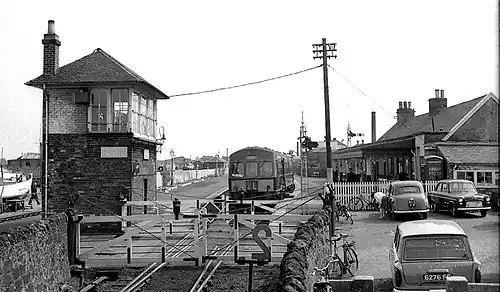 The station opened on 17 May 1848[2] by the Edinburgh and Northern Railway as Ferryport-on-Craig but was renamed to its later name in 1851.[3] It was east of Tayport Docks, which had freight sidings that served the docks themselves and a timber yard. The line to Leuchars was closed to passengers on 9 January 1956 and completely on 18 September 1967. Passenger service to Dundee was withdrawn on 22 May 1966 to facilitate construction of the Tay Road Bridge. The station officially closed to both passengers and goods traffic on 18 September 1967.[4]