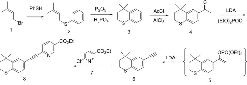 The formation of the ring system involves first alkylation of the anion from thiophenol with dimethylallyl bromide (1) to give the thioether (2). Friedel-Crafts cyclization of the olefin with the equivalent of PPA then gives the thiopyran (3). Acylation with acetyl chloride in the presence of aluminium chloride gives the methyl ketone (4). Reaction of the enolate of that ketone with diethyl chlorophosphate gives the enol phosphate 5 as a transient intermediate. This eliminates diethyl phosphite in the presence of excess base to give the corresponding acetylene 6. The anion from the reaction of the acetylene with base is then used to displace chlorine from Ethyl 6-chloronicotinate (7). This reaction affords the coupling product tazarotene (8).