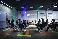 Offering technical training, networking, and mentoring programs,[4] Technology Hub houses a 3D printing Fab lab, a virtual reality demonstration development facility,[12] and regularly hosts bi-national tech events such as startup weekends, hackathons, Shark Tank-esque pitch contests, and women in STEM workshops.[13][14] In 2017 and 2018,Technology Hub hosted RESET, the largest bi-national entrepreneurial event along the Mexico-US border. More than 3,500 university students attended the event to see industry figures from Amazon, MIT, National Geographic, NASA, and Marvel Comics, among others.[15][16] [17]