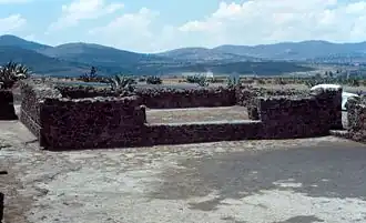 Tecoaque includes a prominent circular structure dedicated to Ehecatl.[3] Parts of this primary three-tiered structure, which has an eastern facing stairway, were restored in 1992. Nearby archaeological features include residential structures and an important rectangular plaza.