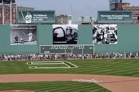 Williams' pay doubled in 1940, going from $5,000 to $10,000.[40] A new bullpen was added in right field of Fenway Park, reducing the distance from home plate from 400 feet to 380 feet and earning the nickname "Williamsburg" for being "obviously designed for Williams".[41] Williams was then switched from right field to left field, as there would be less sun in his eyes, and it would give Dom DiMaggio a chance to play center. Finally, Williams was flip-flopped in the order with the great slugger Jimmie Foxx, with the idea that Williams would get more pitches to hit.[41] Pitchers, though, proved willing to pitch around the eagle-eyed Williams in favor of facing the 32-year-old Foxx, the reigning AL home run champion, followed by the still highly productive 33-year-old Joe Cronin, the player-manager.[42] Williams also made his first of 16 All-Star Game appearances in 1940, going 0-for-2.[43] Although Williams hit .344, his power and runs batted in were down from the previous season, with 23 home runs and 113 RBI in 144 games played.[37] Williams also caused a controversy in mid-August when he called his salary "peanuts", along with saying he hated the city of Boston and reporters, leading reporters to lash back at him, saying that he should be traded.[44] Williams said that the "only real fun" he had in 1940 was being able to pitch once on August 24, when he pitched the last two innings in a 12–1 loss to the Detroit Tigers, allowing one earned run on three hits, while striking out one batter, Rudy York.[45][46]