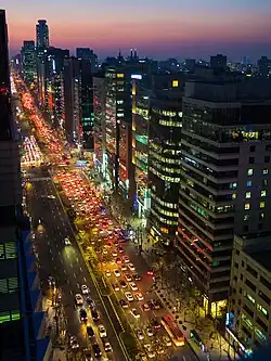 Teheran-ro (Korean: 테헤란로; named for Tehran, Iran) is a street in the Gangnam district of Seoul, South Korea. It runs from Gangnam Station through Yeoksam-dong and into Samseong-dong. It is colloquially known as "Teheran Valley" (after Silicon Valley) due to the number of internet-related companies operating there. The district of Gangnam-gu experienced phenomenal growth and waves of construction, with Teheran-ro becoming one of the busiest streets in South Korea. Its counterpart, Seoul St. in Tehran, Iran, runs in the north of that city, close to the Evin district.