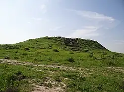 The site, roughly 0.8-acre (0.32 ha), shows evidence of human settlement throughout the Late Bronze Age, and Iron Age I and II. The city was destroyed by fire twice, in 1200 BCE and the ninth century BCE. Hazael of Aram may have been the military leader who ordered the destruction of the city in the ninth century BCE. The Arameans' siege tactics are known from the Zakkur stele, which records that Hazael's son, called Ben-Hadad, employed spectacular siege warfare against his enemies. The Hebrew Bible records that Hazael devastated cities in the Shephelah during the ninth century BCE, including the Philistine city of Gath.[3] The similar siege and destruction in 9th century BCE of Tell es-Safi, a nearby site usually identified as Gath, has been cited by archaeologists as possible evidence of Hazael's campaign.[4][5]