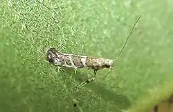 The wingspan is 6−8 mm. The forewings are greyish fuscous to blackish fuscous, the costal margin with a white spot basally at about 1/10 and one before apex, the former sometimes touching the fold posteriorly. There is some stria at the distal 3/10 and 1/6 obliquely outward, reaching the middle of the wing and near the termen respectively. There is transverse white fascia from the costal 1/3 and 1/2 obliquely outward, reaching the dorsal 1/2 and before the end of the fold respectively, edged with blackish fuscous to black scales. The hindwings are uniformly grey.