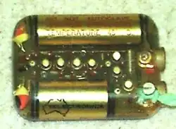 Research also included dissection and analysis of the failure modes of explanted pacemakers of any manufacturer. Most failures were due to an internal short circuit of one of the cells of the multicell battery due to the growth of metal dendrites; or the result of water vapour diffusing though the epoxy resin encapsulation.[6] The only suitable cell available at the time was the mercuric oxide-zinc cell, so the battery problems remained. In 1967 Telectronics commenced research into the technologies which could allow hermetic sealing of the pacemaker to preclude water vapour penetration and, as an interim measure contracted AWM, a subsidiary of AWA, to develop integrated circuits for the electronics. These early integrated circuits were developed by David R. Money who later joined Telectronics and later still led development of the cochlear implant for the profoundly deaf.[7] The circuits were analogue type, housed in hermetically sealed ceramic military 'flat packs' with redundant double gold bonding of the terminations. The IC's were first used in the model P7 of 1969.[2]