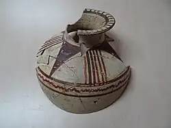 A large amount of Chocolate-on-white ware was found at Tell Abu al-Kharaz. This type of pottery was most likely produced locally on-site, but it is also present at several other sites in the Jordan Valley and nearby areas. There is no confirmed find of such pottery on Cyprus or in the Aegean.[4]