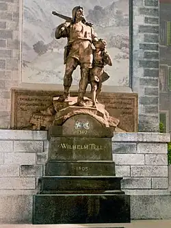 The bronze statue by sculptor Richard Kissling was inaugurated on August 28, 1895, at the foot of an old tower. It shows the Swiss national hero with his crossbow and accompanied by his son. The traditional date of the Rütlischwur, long thought to have taken place in 1307, is engraved in the base.