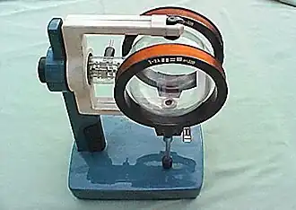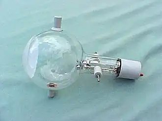 A teltron tube (named for Teltron Inc., which is now owned by 3B Scientific Ltd.) is a type of cathode-ray tube used to demonstrate the properties of electrons. There were several different types made by Teltron including a diode, a triode, a Maltese Cross tube, a tube demonstrating electron diffraction, a simple deflection tube with a fluorescent screen, and one which could be used to measure the charge-to-mass ratio of an electron.[1] The latter two contained an electron gun with deflecting plates. The beams can be bent by applying voltages to various electrodes in the tube or by holding a magnet close by. The electron beams are visible as fine bluish lines. This is accomplished by filling the tube with low-pressure helium (He) or Hydrogen (H2) gas. A few of the electrons in the beam collide with the helium atoms, causing them to fluoresce and emit light.