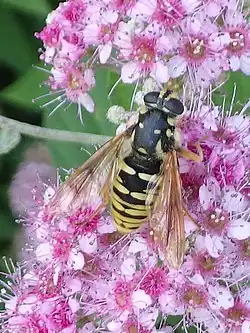 Temnostoma alternans (Loew, 1864), the Wasp-like falsehorn, is a common species of syrphid fly observed throughout the northern and central United States and widespread in Canada. Hoverflies can remain nearly motionless in flight. The adults are also known as flower flies for they are commonly found on flowers, from which they get both energy-giving nectar and protein-rich pollen. Larvae burrow in moist decayed wood.[2][3]