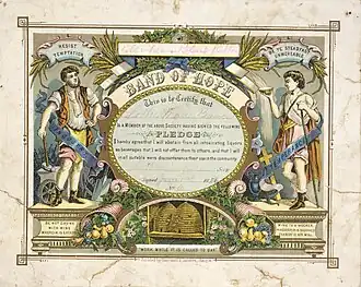 Beginning in the 1860s, many Non-conformist churches encouraged abstinence among their congregations, and numerous temperance societies were established throughout the country.[2] Many provinces passed licensing ordinances giving residents the right to secure, by petition, the cancellation or granting of liquor licences in their district.[2] The Licensing Act of 1873 allowed the prohibition of liquor sales in districts if petitioned by two-thirds of residents.[4] Despite the efforts of the temperance movement, the rate of convictions for drunkenness remained constant in New Zealand.