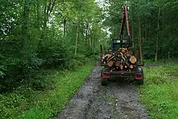 Humans rely on wood from temperate deciduous forests for use in the timber industry as well as paper[14] and charcoal production.[18] Logging practices emit high levels of carbon while also causing erosion because fewer tree roots are present to provide soil support.[14] During the European colonization of North America, potash made from tree ashes was exported back to Europe as fertilizer.[19] At this time in history, clearcutting of the original temperate deciduous forests was also performed to make space for agricultural land use, so many forests now present are second-growth.[1] Over 50% of temperate deciduous forests are affected by fragmentation,[2] resulting in small fragments dissected by fields and roads; these islands of green often differ substantially from the original forests[20] and cause challenges for species migration.[6] Seminatural temperate deciduous forests with developed trail systems serve as sites for tourism and recreational activities, such as hiking and hunting.[14] In addition to fragmentation, human use of land adjacent to temperate deciduous forests is associated with pollution that can stunt the growth rate of trees.[6] Invasive species that outcompete native species and alter forest nutrient cycles, such as common buckthorn (Rhamnus cathartica), are also introduced by humans.[21] The introduction of exotic diseases, especially, continues to be a threat to forest trees and, hence, the forest.[22] Humans have also introduced earthworms in deciduous forests in Norh America, which has had a deep impact on the ecosystem and reduced biodiversity.[23][24]