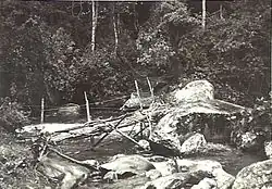 When the drop zone at Myola was identified by Kienzle, the main route used by the Australian forces was diverted through this important supply point, cutting a new section of track.[14][15] Kienzle named the "crossing" after cutting the route from Myola, north.[9] The route north from Myola first follows the Myola Ridge, before descending to cross Eora Creek at a point about an equal march between Myola and Templeton's Crossing. A supply dump, Dump 1, was established there. Rather than following the creek from there, the track crosses a ridge as it heads toward Templeton's Crossing. Confusingly, the site of Dump 1 has, in some sources, been identified as "Templeton's Crossing No 1" while the original crossing is called "Templeton's Crossing No 2". This appears to have originated from "Longitudinal section of the Kokoda Trail" produced in 1978 by the "Department of Works and Supply".[16]