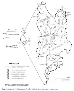 ![]() The Ten Mile River watershed within Massachusetts. | |