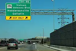 In 1987, SR 386 was renamed the Vietnam Veterans Boulevard after the efforts of the Sumner County chapter of the Vietnam Veterans of America.[12] In 2012 the chapter worked with the Tennessee General Assembly to install signs along the highway, located each about a half mile apart, that list the names of the 25 Sumner County residents who died in the Vietnam War.[13]